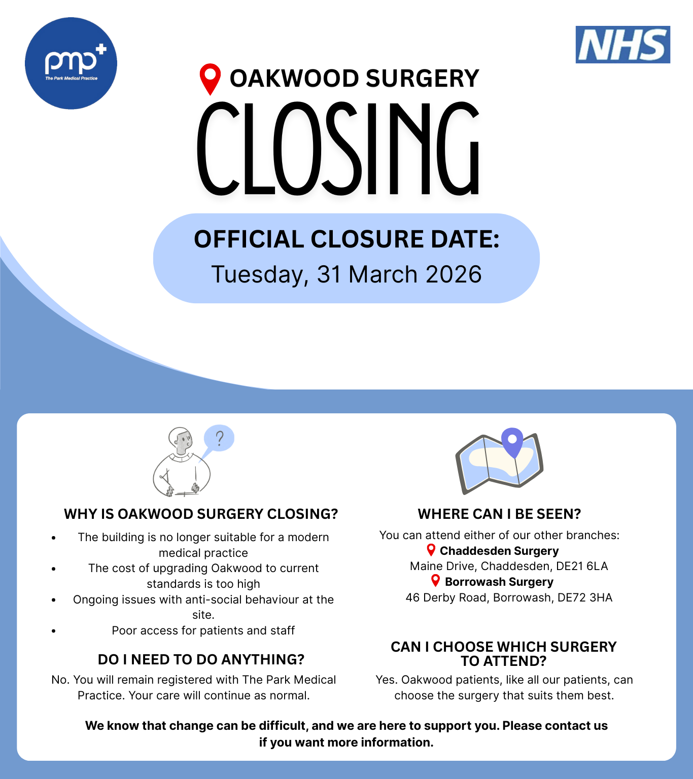 Thank you for your understanding and continued support. If you have any questions or concerns, please contact us. We value your feedback and hope you will remain part of Park Medical Practice during this transition.